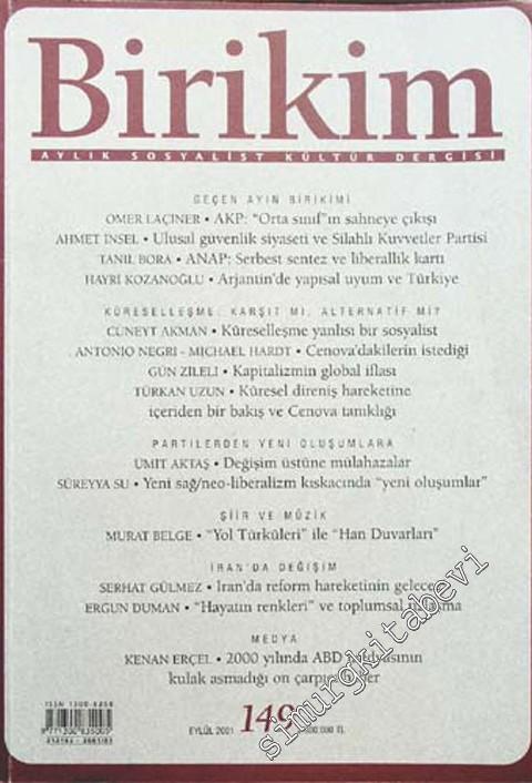 Geçen Ayın Birikimi Ömer Laçiner: Adalet ve Kalkınma Partisi; ‘Orta Sınıf'ın Sahneye Çıkışı Ahmet İnsel: Ulusal Güvenlik Siyaseti ve Silahlı Kuvvetler Partisi Tanıl Bora: ANAP; Serbest Sentez ve Liberallik Kartı Hayri Kozanoğlu: Arjantin'de Yapısal Uyum ve Türkiye Cüneyt Akman: Küreselleşme Yanlısı Bir Sosyalist Antonio Negri - Michael Hardt: Cenova'daki Protestocuların İstediği Gün Zileli: Kapitalizmin Global İflası Türkan Uzun: Küresel Direniş Hareketine İçeriden Bir Bakış ve Cenova Tanıklığı Ümit Aktaş: Değişim Üstüne Mülahazalar Süreyya Su: Yeni Sağ / Neo - Liberalizm Kıskacında Daralan Siyaset ve Türkiye Politikasında ‘Yeni Oluşumlar' Murat Belge: ‘Yol Türküleri' ile ‘Han Duvarları' Serhat Gülmez: İran'da Reform Hareketinin Geleceği Ergun Duman: ‘Hayatın Renkleri' ve Toplumsal Uzlaşma Kenan Erçel: 2000 Yılında ABD Medyasının Kulak Asmadığı On Çarpıcı Haber