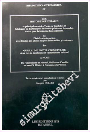 DES HISTOIRES ORIENTALES et principalement des Turks ou Turchikes et Schitiques ou Tartaresques et aultres qui en sont descendus, ?uvre pour la troisième fois augmenté. Et Divisé en trois parties, avec l'indice des choses les plus mémorables y contenues. Par GUILLAUME POSTEL COSMOPOLITE, deux fois de là retourné et véritablement informé. Texte modernisé, introduction et notes par Jacques ROLLET,