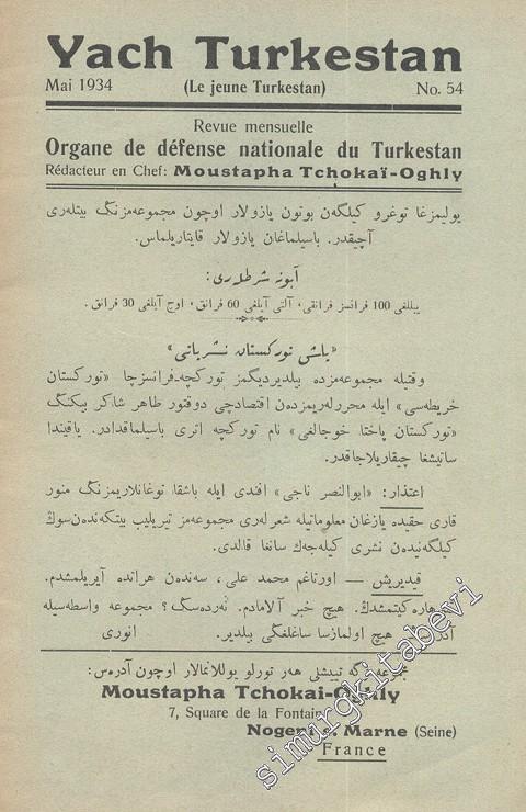Yach Turkestan - Organe de défense nationale du Turkestan - No: 54, Mai 1934